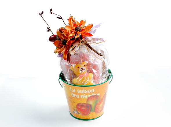 秋らしいミニバケツの中に焼菓子を詰めて、秋のお花のリボンを添えました。